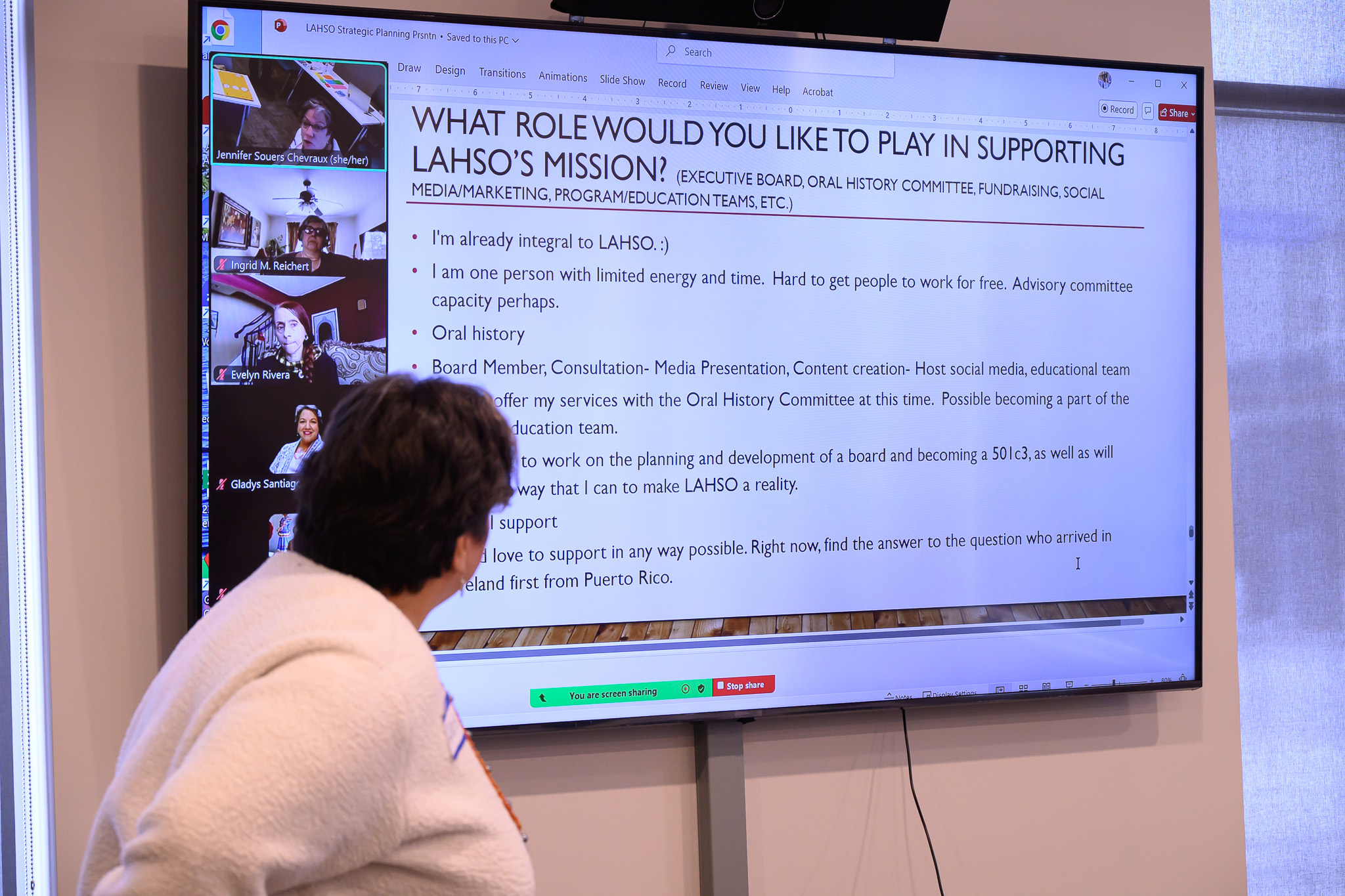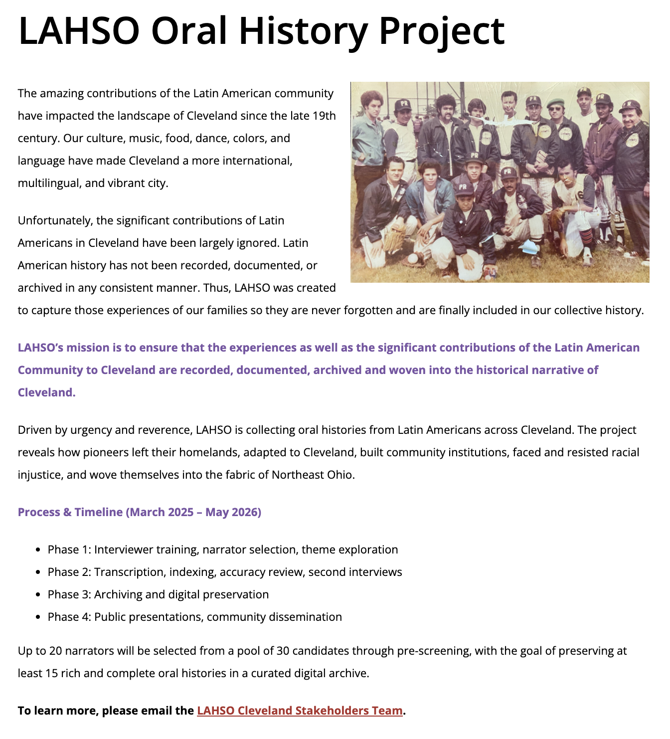 Hence, LAHSO was born. It was clear from the getgo that this public history recording effort was going to be a massive undertaking and would require a grassroots community effort embraced and planned for by the community, for the community. One of the members involved in these initial discussions, Dr. Evelyn Rivera, set out to recruit and organize what is now called the LAHSO of Cleveland Stakeholder Team. Dr. Rivera personally contacted hundreds of people over the course of the following eight months, welcoming and inviting them to join the team that would launch community conversations and a planning process on how Latin American history in Cleveland would be documented. The team met for the first time virtually on January 25, 2024. The team currently consists of 24 members representing diverse ethnic and racial backgrounds, ages, as well as organizations, churches and archival sites.